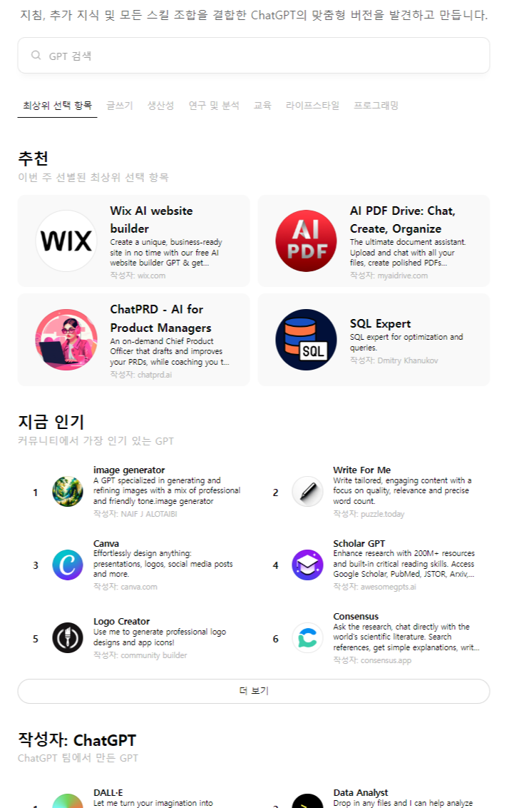 ChatGPT는 특정 주제에 특화된 세팅으로 대화를 시작할 수 있는 서비스가 있다.