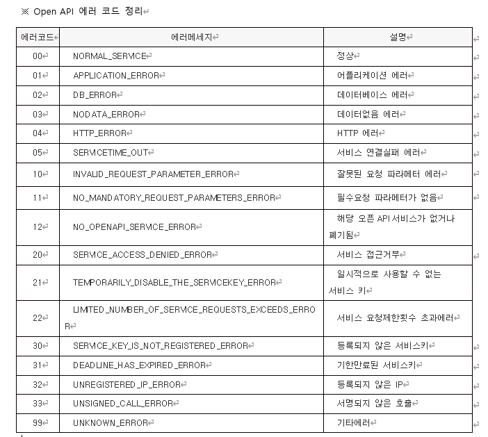 api에서 제공하는 에러 코드이다.