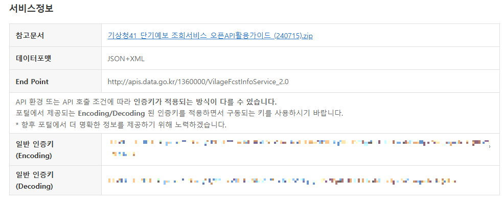 공공데이터 API는 위와 같이 인코딩 키와 디코딩 키를 둘 다 주고 잘 동작하는 키를 사용하라고 한다.