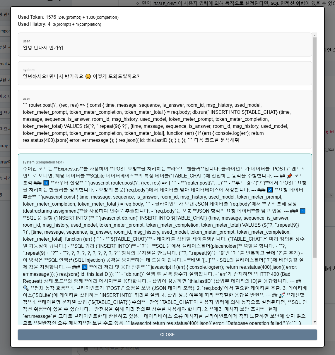 즉, 한 번의 질문/응답에 3개의 history를 사용했고 1576 토큰을 사용했다.