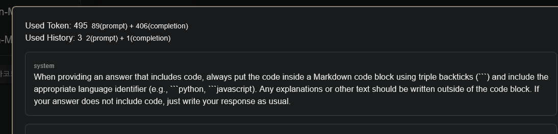 instruction prompt 는 msg history에 role: system 으로 항상 포함되며, 전반적인 응답 지침을 가이드한다.