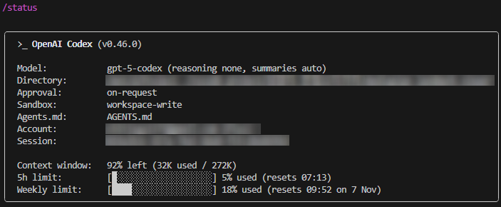 5h limit은 리팩토링이나 패키지명 수정처럼 코드 베이스를 넓게 탐색하는 질의를 반복하면 도달할 때가 있다.