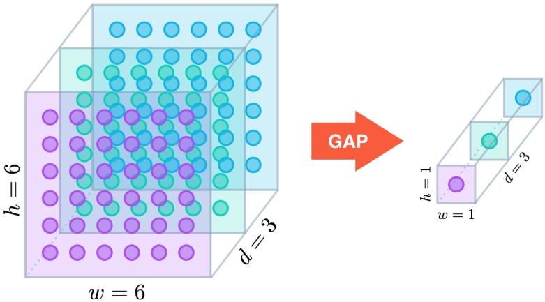 반면 GAP은 (H×W×C) feature map을 (C) 차원으로 축약하여