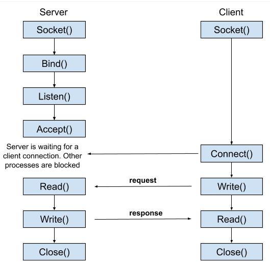 서버는 Socket을 생성하고 주소를 할당(Bind)한다. 그 후 연결 요청을 기다리고(Listen) 연결을 허용(Accept)한다. 연결은 유지되며 통신하다가 로직에 따라 연결을 해제한다.
