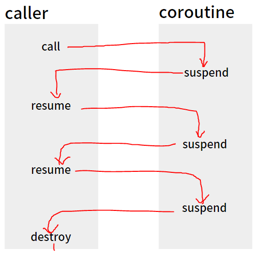 서브루틴과 차이는 실행 후 종료되는게 아닌 대기(suspend) 상태가 가능하다는 것, 그래서 동등한 관계라 말한다.